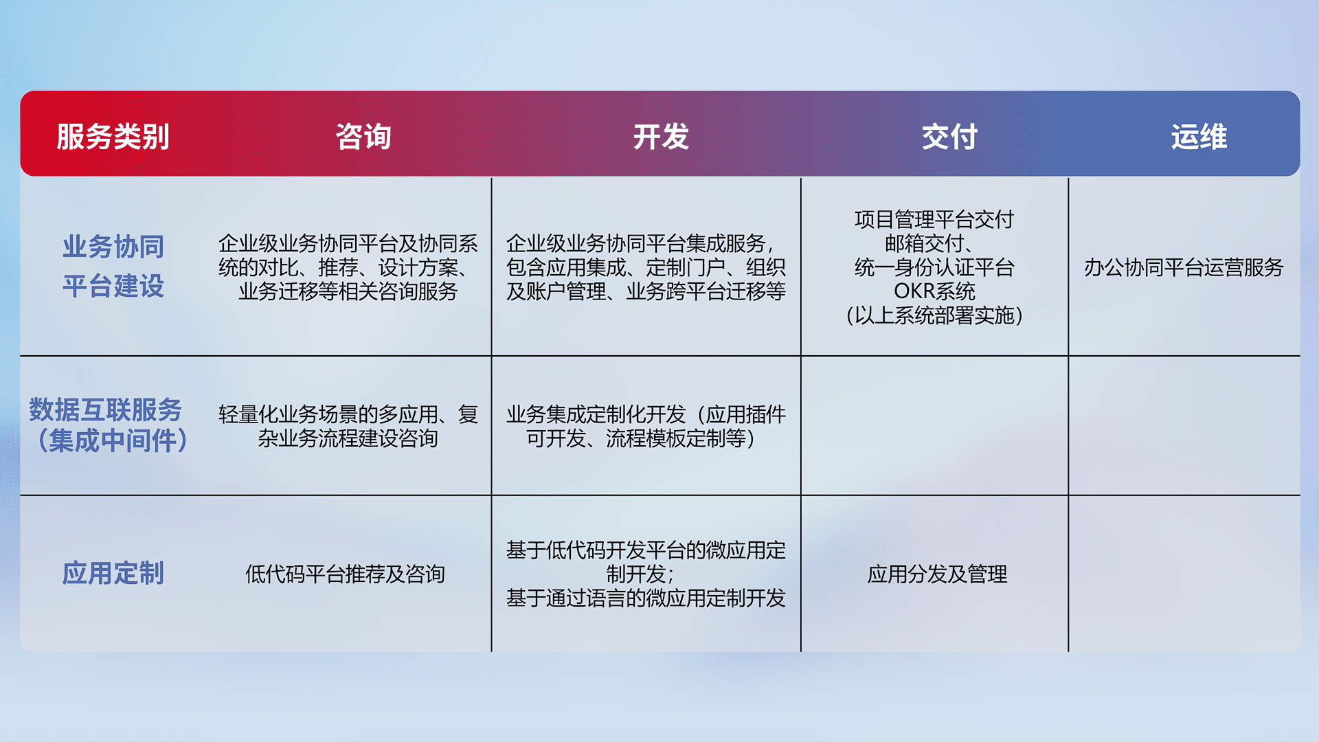 针对钉钉、、、、企微、、IDaas等平台级产品提供产品的规划、、方案、、、交付、、、、定制化开发等服务,,,实现如统一协同办公、、智能客户服务、、、、混合会议管理、、、智能数据查询、、、等业务场景,,,,实现数字化转型。。