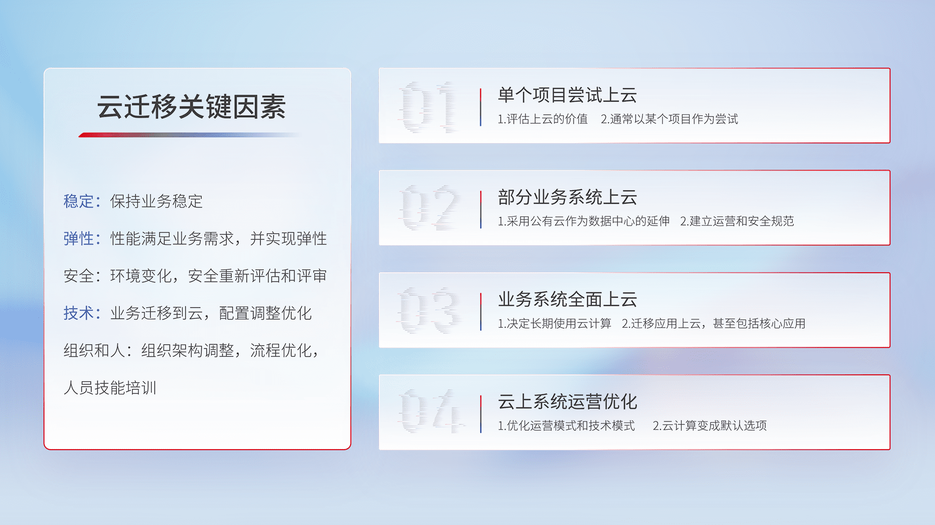 结合实际业务,,从规划设计、、云平台选型、、、、云原生改造、、、数据迁移、、、集成交付,,,迁移全过程为客户识别最佳上云路径,,,,做好风险识别管理,,设计网络架构、、、身份权限、、、、安全审计合规、、操作审计、、日志审计、、、、监控告警策略、、多站点容灾设计等,,,,对云上基础设施进行整体规划,,,,提升IT治理水平,,,以满足弹性、、高可用、、高性能的需求。。