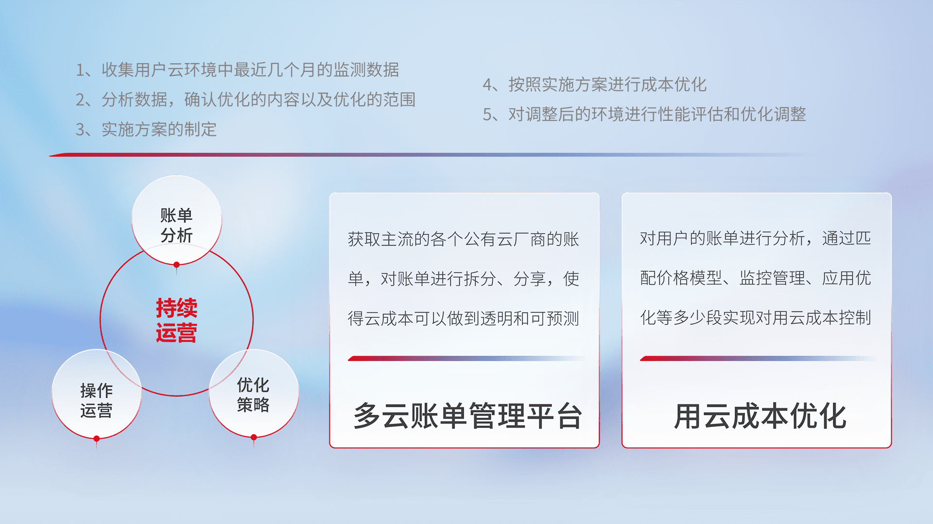 通过多云纳管,,,,以统一的资源数据模型把客户的云资源进行抽象和封装,,,进而实现对多云资源的统一操作,,保障云资源管理的可靠性、、、、稳定性与可用性。。。量身定制化运维内容,,,,配置、、、、开发运维、、、、补丁管理、、备份、、、监控、、、认证和访问管理、、、、审计和日常巡检等,,,,保障在用云过程中的可靠度,,,稳定度以及高可用率。。。。