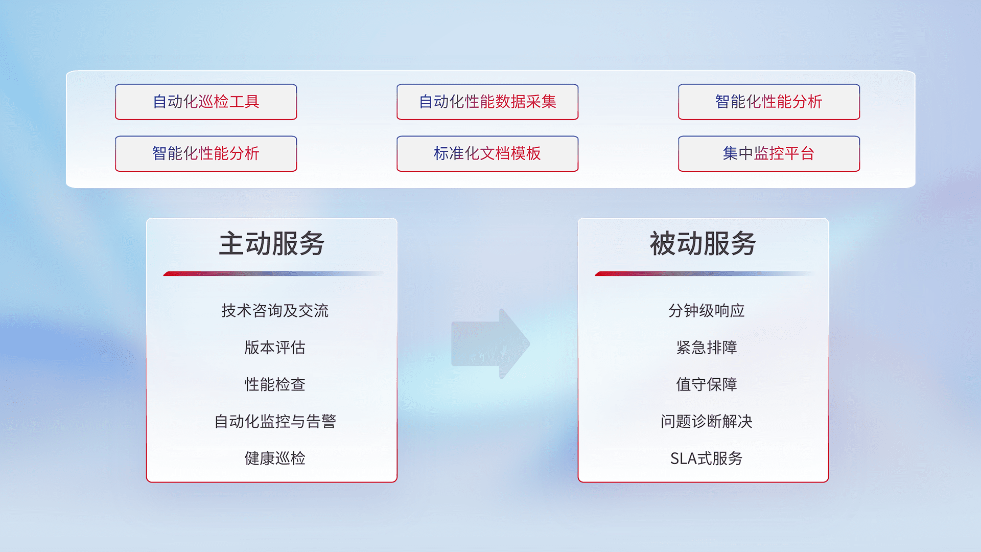 智能化工具和标准化文档,,,,保障服务质量,,,提供主动服务(包含技术咨询、、版本评估、、、性能检查、、、、自动化监控与告警、、、、健康巡检)和被动服务包含(分钟级响应、、、紧急排障、、、值守保障、、问题诊断解决、、、SLA服务)。。。